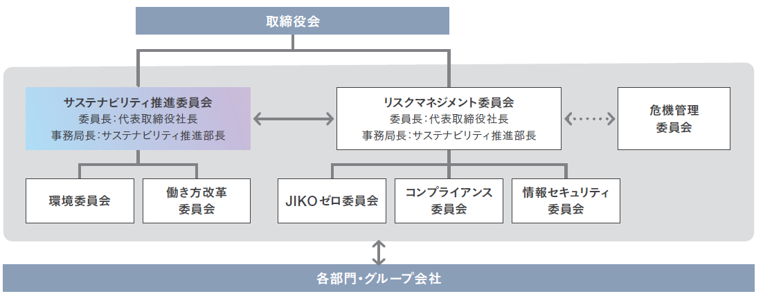 また、代表取締役社長の直下にサステナビリティ推進部を設置し、リスクマネジメント委員会、働き方改革委員会、環境委員会等の運営と、全社横断的なサステナビリティ活動の推進を行っています。